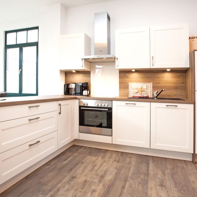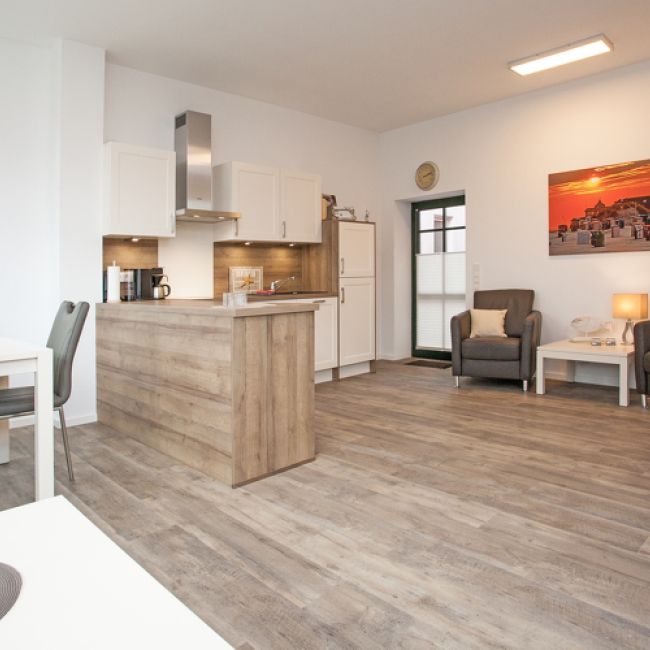 Das großzügige Wohn- und Esszimmer mit integrierter Küche bietet in der gemütlichen Essecke viel Platz zum gemeinsamen Spielen und Klönen. Von hier gelangen Sie u. A. auf die eigene Terrasse.